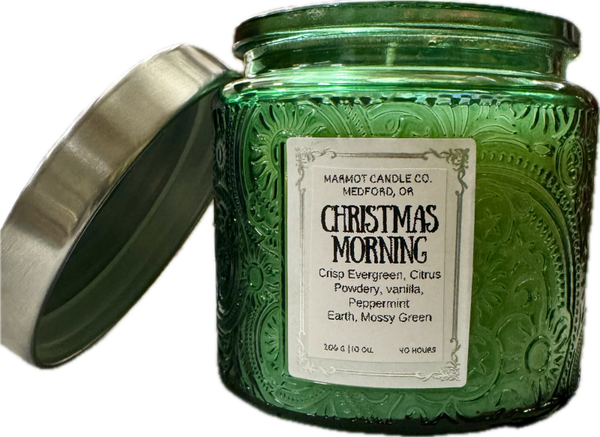 Green 10 ounce Embossed Candle Jar with Tin Lid - Christmas Morning